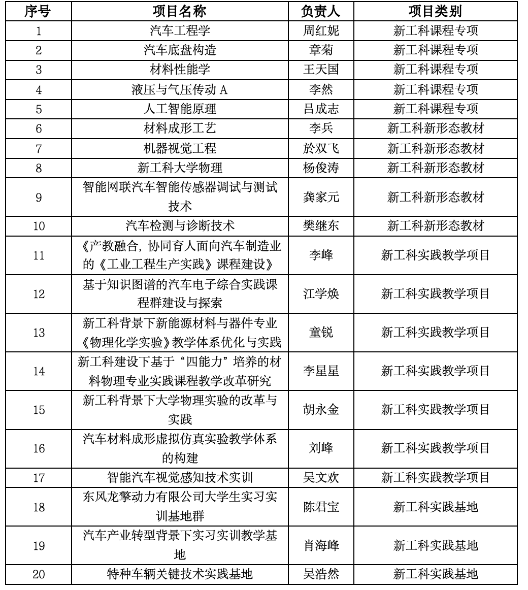 本网讯(文/梁姗姗)近日,湖北省教育厅发布了《省教育厅关于公布2024年度新工科建设项目的通知》(鄂教高函【2025】4号),学校《汽车工程学》《汽车底盘构造》等20个新工科项目获批立项,其中新工科课程建设项目5项,新工科新形态教材建设项目5项,新工科实践教学项目7项,新工科实践基地建设项目3项。