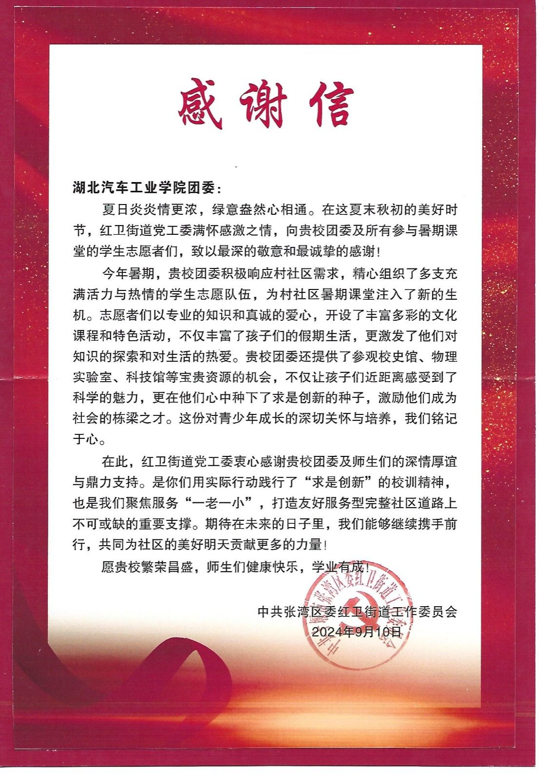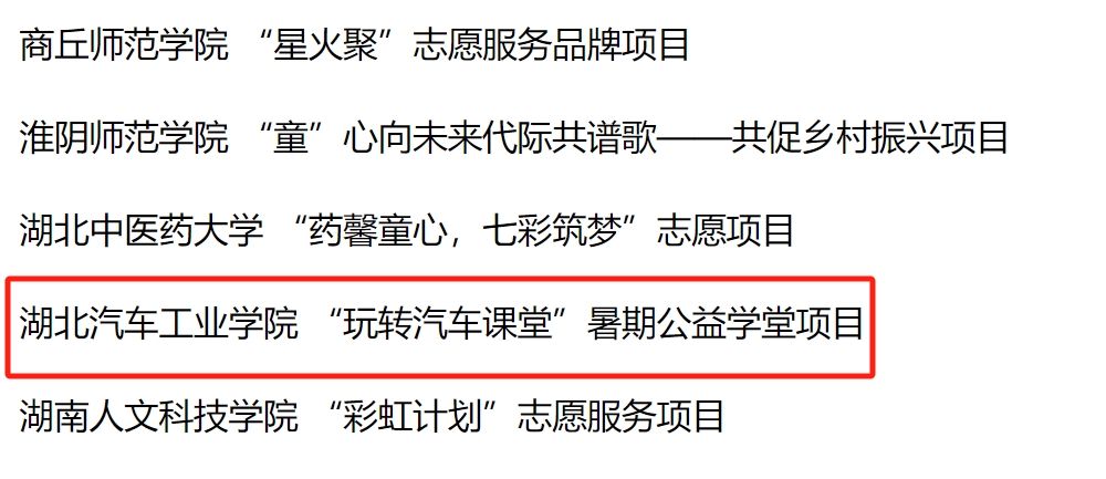 2024年暑期,校团委联合各二级学院组建16支以“科普汽车知识、传播汽车文化、培育创新初心”为目标的“玩转汽车课堂”实践团队,奔赴十堰、襄阳、武汉等地的社区实施项目;服务青少年超1300余人,得到中国教育在线等媒体的广泛报道。项目成效得到所服务社区居民的高度认可,张湾区红卫街道特向学校发来感谢信。团省委副书记蔡伟伟亦于2024年7月莅临“玩转汽车课堂”公益学堂现场调研,充分肯定了项目的成果。