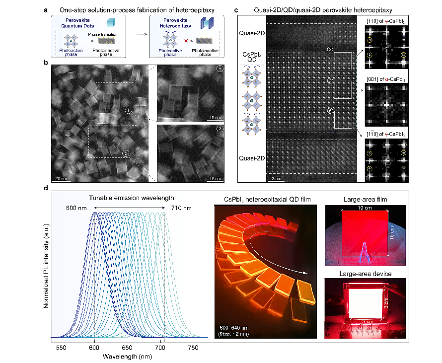 研究针对新型钙钛矿超高清显示技术中纯红光CsPbI3钙钛矿量子点材料相稳定性差这一世界难题,率先提出“外延异质结界面应力操控”策略,首次利用全溶液法实现钙钛矿范德华外延异质结的大面积原位可控制备,并结合先进的低剂量球差透射电子显微镜技术,成功揭示钙钛矿外延异质结构的界面应力对量子点晶格结构的调控机制,突破材料稳定性与器件性能双重瓶颈,研发出高效率与高稳定性兼备的纯红光钙钛矿电致发光器件(LED),为下一代超高清显示技术发展提供了关键技术支撑。
