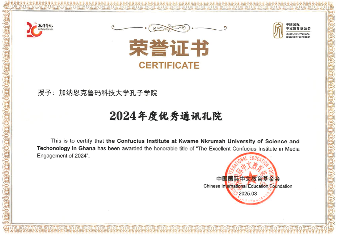 本网讯(文/何静)近日,中国国际中文教育基金会公布了“2024年度优秀通讯孔院”名单,beat365与加纳恩克鲁玛科技大学共建的孔子学院成功入选,成为全球61所获奖孔院之一。