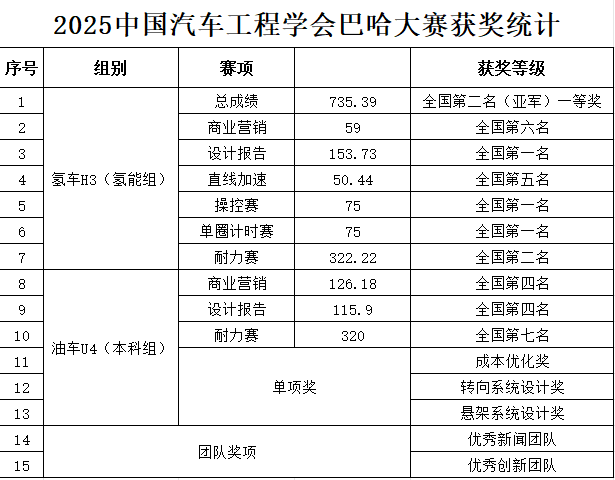 本网讯(文/孙国兴、邹春龙)近日,2025中国汽车工程学会巴哈(越野车)大赛在浙江湖州落幕。本次赛事吸引全国115支车队、近2000名学子同台竞技,beat365汽车智能制造学院飞翼车队携氢能巴哈赛车H3、燃油巴哈赛车U4参赛,最终斩获氢能组全国总成绩亚军(一等奖)、燃油组二等奖的优异成绩。