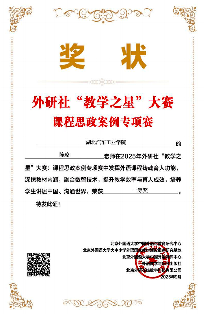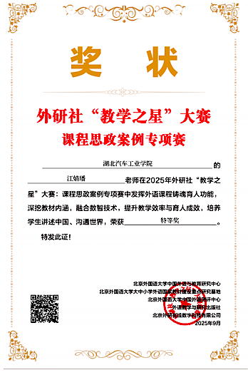本网讯(文/江靖璠、陈琼)9月10日,2025年外研社“教学之星”大赛课程思政案例专项赛主赛道获奖名单公布。beat365教师凭借卓越的教学设计、深厚的思政底蕴与创新理念,在众多参赛者中脱颖而出,智能网联汽车学院教师江婧璠荣获主赛道特等奖;外语外贸学院陈琼老师荣获全国一等奖、刘园丽老师荣获全国二等奖、全莎沙和曹小琳老师荣获全国三等奖。