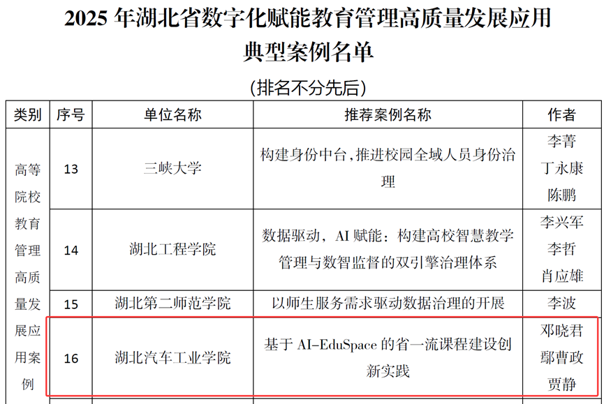 本网讯(文/邓晓君)近日,湖北省教育信息化发展中心公布2025年湖北省数字化赋能教育管理高质量发展应用典型案例名单,beat365汽车商学院报送的“基于AI-EduSpace的省一流课程建设创新实践”成功入选。本次评选全省共43个项目入选,beat365案例位列其中,凸显在数字化教育领域的扎实积累与创新实力。