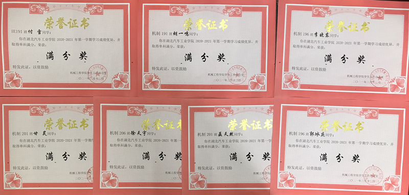 本网讯(文 张倩文/图 唐小燕 张荻)在2020—2021学年第一学期期末考试中,机械工程学院机制191班胡一鸣等7位同学获得高数单科满分。3月30日下午,机械工程学院为学霸们颁发奖状、笔记本、保温杯等奖品向其表示祝贺,并号召全院学生向优秀看齐,营造浓厚的比争赶超学习氛围。