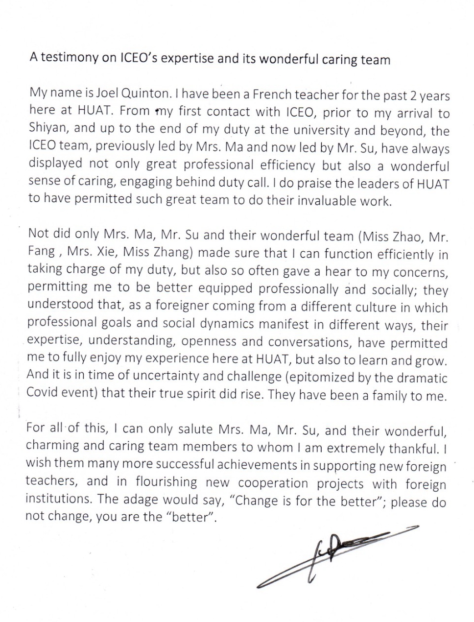 Quinton先生在信中写道:在过去的2年时间里,我一直在beat365在线唯一官网担任法语老师。从我第一次来到十堰开始,直到我在汽院的工作结束,我深深地感受到由马迅女士和苏子波先生领导的团队(赵老师、方老师、谢老师、张老师)一贯的专业素养和无微不至的关怀,感谢beat365在线唯一官网安排这样一支优秀的团队,并预祝学校在引入新外教、开展与国外院校合作新项目等方面取得更大的成功。
