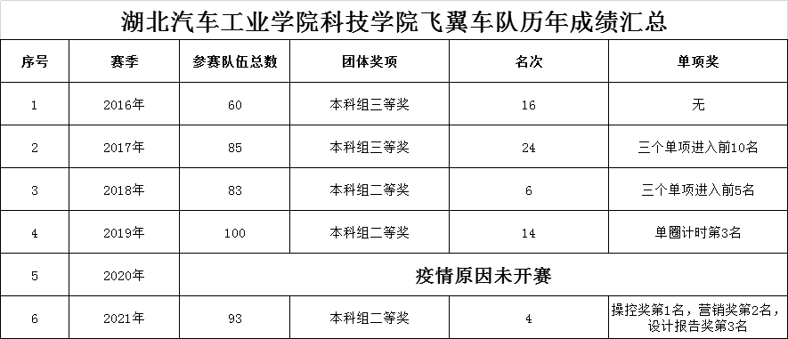 在2021年的比赛中,飞翼车队首次获得三个单项奖——本科组操控比赛第一名,商业营销第二名,设计答辩第三名,总成绩排名第四,力压众多985、211高校,刷新了车队历史最好成绩。