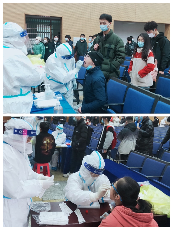 根据学校的部署安排,2月21日晚20:30分在学校大礼堂,国药东风总医院对从武汉返校师生开展核酸检测采样工作,为确保核酸检测工作快速顺利进行,检测现场共设置了八个核酸检测台,核酸采样持续到凌晨,共采集4100余人次。