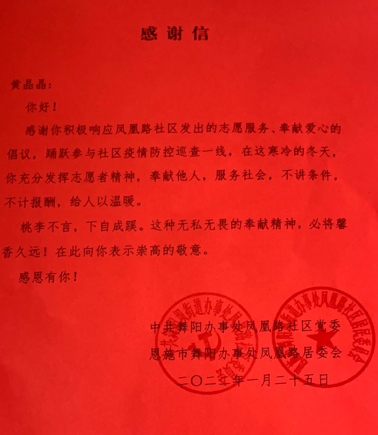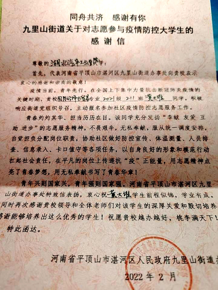 十堰市张湾区汉江路街办的来信中说到:“大数据211班刘雲龙同学没有顾及个人安危,不怕苦不怕累坚持与社区工作者们共同奋战在抗疫一线。他作为一名志愿者,哪里忙,哪里的工作岗位需要,他就兢兢业业地投入到哪里的工作岗位中,得到了社区工作人员的认可和称赞。”