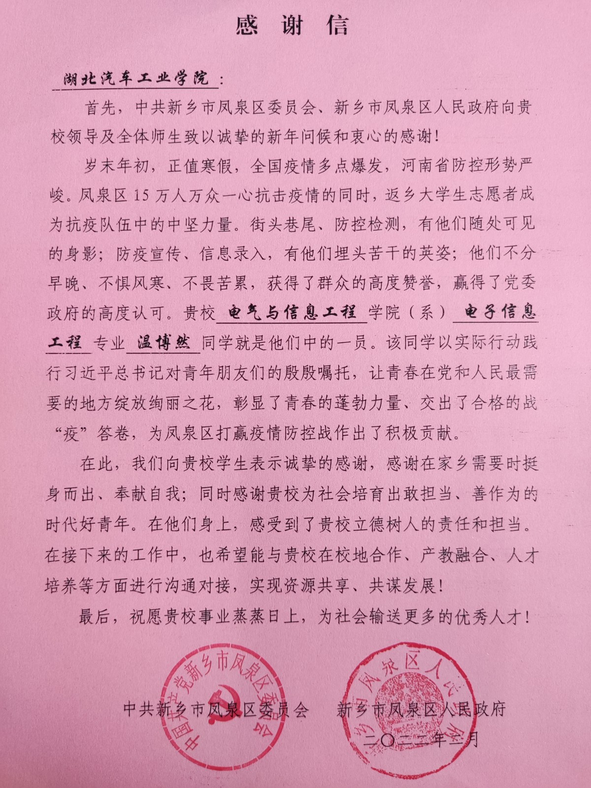 本网讯(文/候猛)日前,电气与信息工程学院收到一封来自中共新乡市凤泉区委员会、新乡市凤泉区人民政府的感谢信。信中对电气与信息工程学院电信213班温博然同学在疫情防控志愿服务工作中的贡献表示衷心的感谢和高度认可,感谢beat365为社会培育出了敢担当、善作为的时代好青年。通过学生疫情期间的工作表现,当地政府感受到了beat365立德树人的责任和担当。