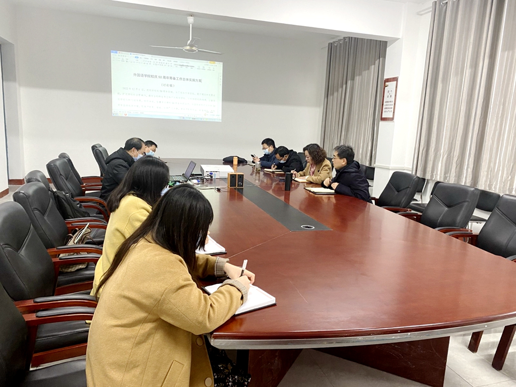 本网讯(文/图 蔡凤梅)为了统一、有序、高效做好学校五十周年校庆活动的相关工作,确保学校校庆工作顺利进行,外国语学院于2月28日下午在学院会议室召开了学院校庆工作部署会议,分党委书记宋涛、院长朱战炜、副院长杨荣广、外院校庆工作策划人柯宁立老师以及校庆工作小组成员参加了会议。