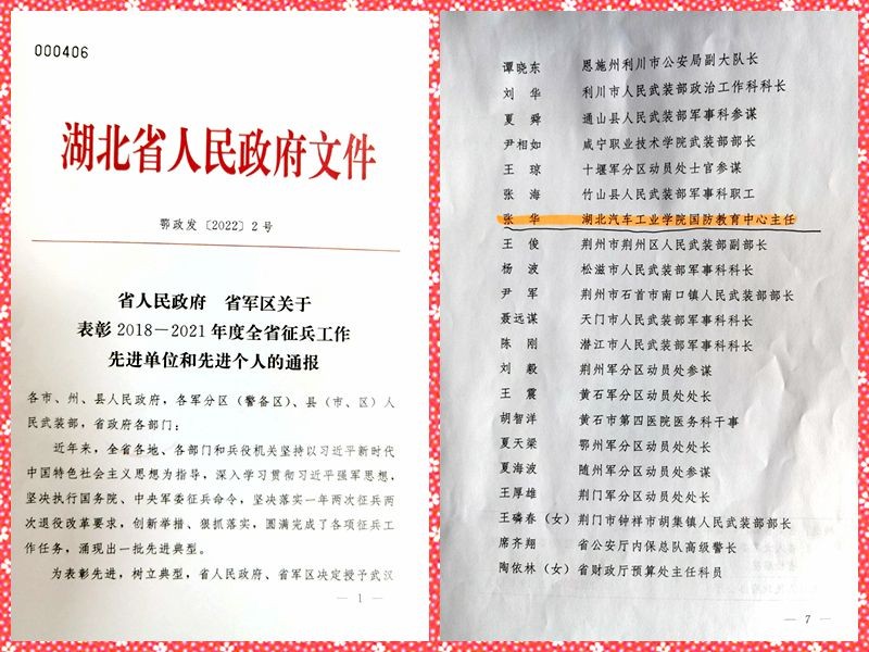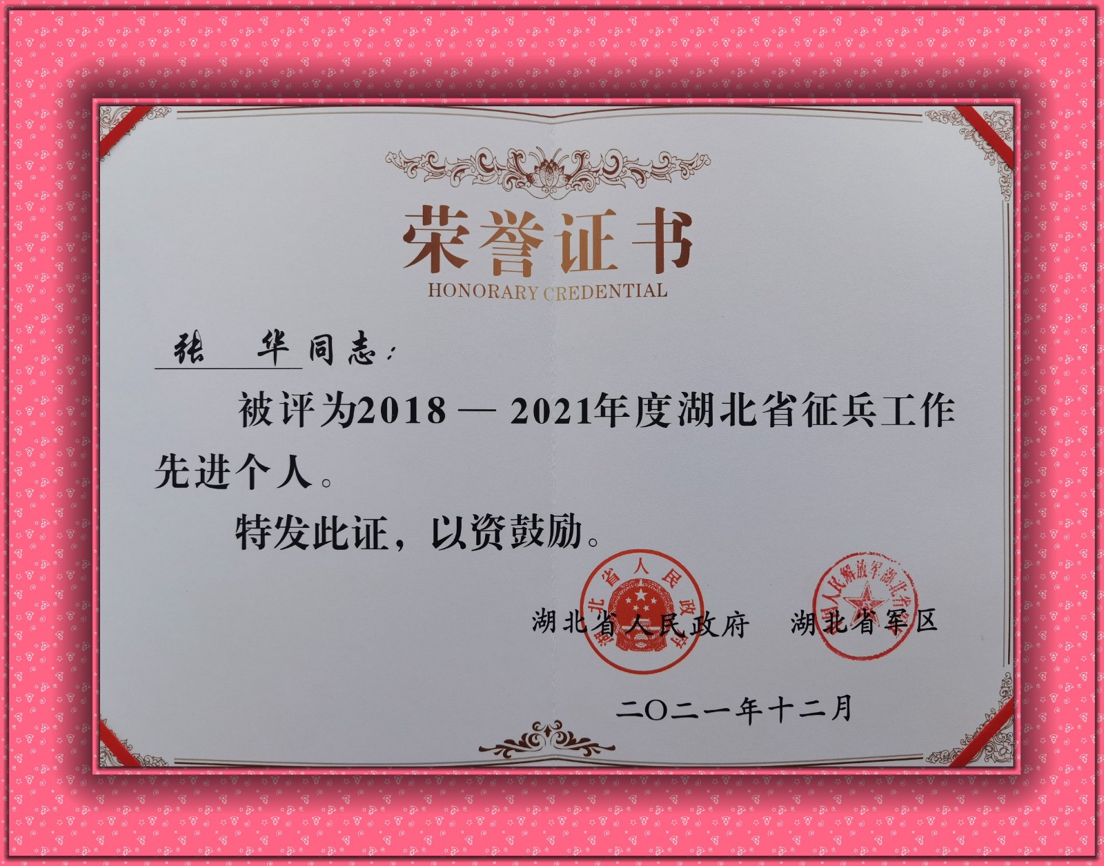 本网讯(文 赵伟/图 张华)为表彰先进、树立典型,激励广大征兵工作人员在今后工作中奋发进取、建功立业,经省人民政府、省军区决定,授予50个单位“湖北省征兵工作先进单位”称号、49名同志“湖北省征兵工作先进个人”称号,beat365保卫处(人武部)张华老师受到通报表彰。