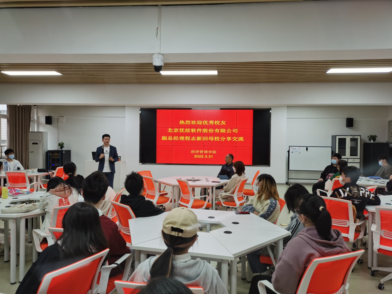 本网讯(文/张朋刚 杨福龙)为提升学生的职业规划意识,帮助他们更好的树立人生目标,3月31日下午,在第五教学楼四楼新商科实验室,经济管理学院邀请了国际经济与贸易专业2014届优秀校友、现任北京优炫软件股份有限公司副总经理程志新回校做分享交流。分享会由学工办主任张朋刚主持。