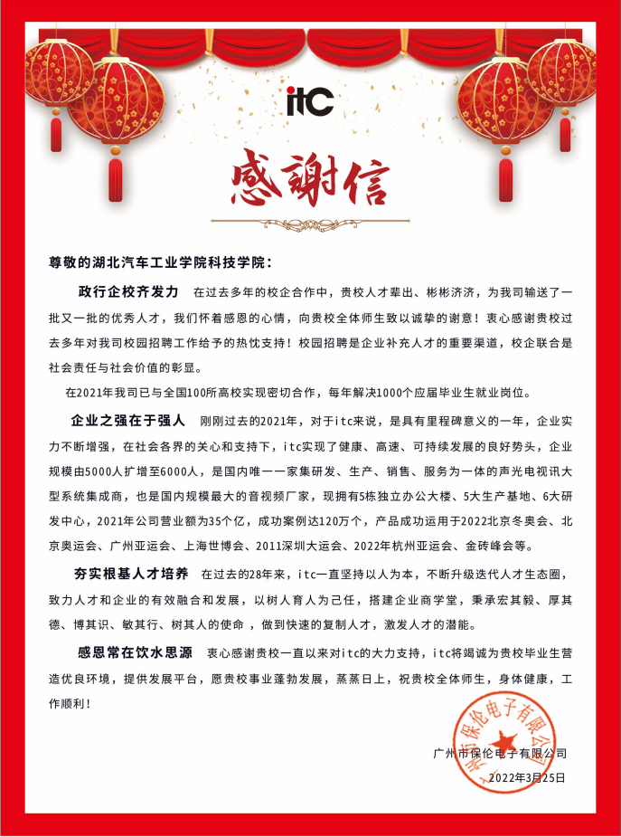 本网讯(文/罗晓瑞)近日,广州市保伦电子有限公司(以下简称itc)向科院发来感谢信,对学院在过去多年校企合作、企业校园招聘工作中给予的支持表示感谢。