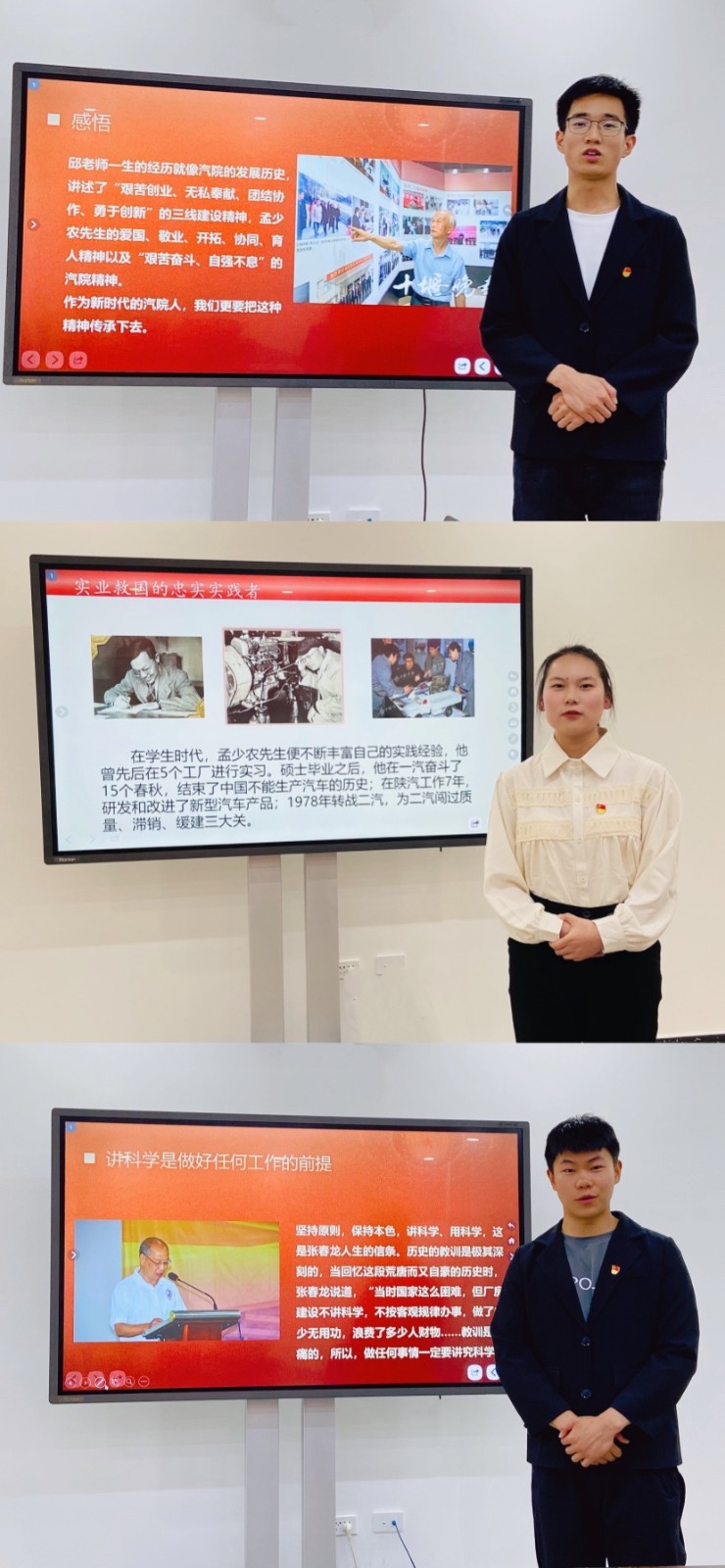 本次微党课的主讲人为学生党员陈浩、武子豪、潘喜悦,主题分别为《八旬退休教师义务讲党史二十载》《情系东风终不悔》《以奋斗为曲,普人生之歌》。陈浩讲述了beat365汽院退休教师邱春正老师的故事,他向我们分享了他自己眼中的邱春正老师的事迹,用自己切身的体会表达了对邱春正老师的敬意。武子豪讲述了湖北汽车工学学院退休教授、张湾公园社区老年大学教师张春龙老师,分别从“我是党员,就要听党的话”“一根扁担,两盏马灯”是二汽创业精神、“发挥余热,奉献社会”三方面讲述了张春龙老师的伟大事迹,不仅让全体党员学习到了张春龙老师身上的精神,也让学生党员对自己的发展目标有了更清晰的规划。潘喜悦为大家讲述了孟少农院士的故事,她介绍了孟少农院士的多重角色,正是在这多重角色之中让全体党员了解了孟少农院士的努力和奋斗精神,特别是对beat365在线唯一官网的奉献精神让全体党员为之感动。