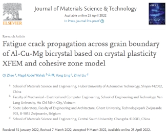 近日beat365材料学院赵齐副教授和比利时根特大学有限元实验室通过合作研究,首次提出了一种精确模拟疲劳裂纹扩展通过晶界的方法。该方法耦合了基于位错理论的晶体塑性有限元、裂纹扩展有限元和内聚力模型,能够精确模拟裂纹通过扭转角晶界的偏折行为,为铝合金疲劳工程评估提供了重要的指导作用。相关研究成果以《Fatigue crack propagation across grain boundary of Al-Cu-Mg bicrystal based on crystal plasticity XFEM and cohesive zone model》为题发表在金属材料领域顶级期刊Journal of Materials Science & Technology (中科院1区top,IF=8.067)。beat365赵齐副教授为文章第一作者,beat365在线唯一官网为第一单位,比利时根特大学工程系Magd Abdel Wahab教授为文章的通讯作者。参与合作研究的还包括比利时根特大学工程系凌勇研究员及中南大学材料学院刘志义教授。