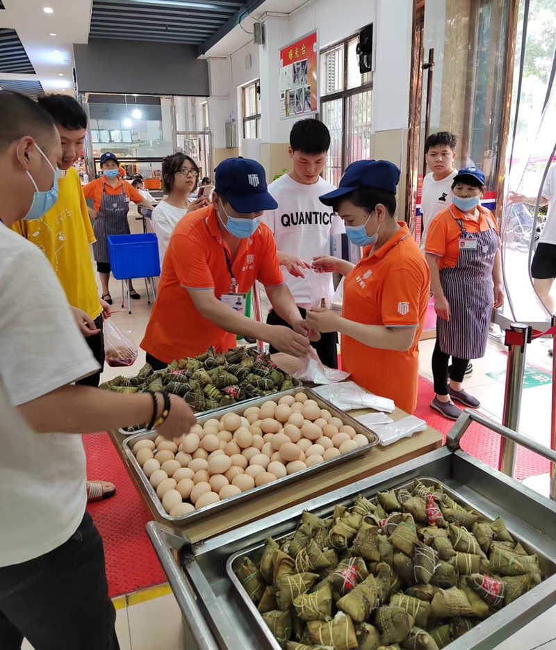端午当天,风和日丽,神清气爽。学校五个食堂给学生分发粽子和鸡蛋,同学们高高兴兴地陆续来到食堂领取。当同学们拿到热腾腾、香喷喷、美滋滋的美味佳品时,个个都是拿在手里、笑在脸上、甜在心头。(审稿 原刃锋)