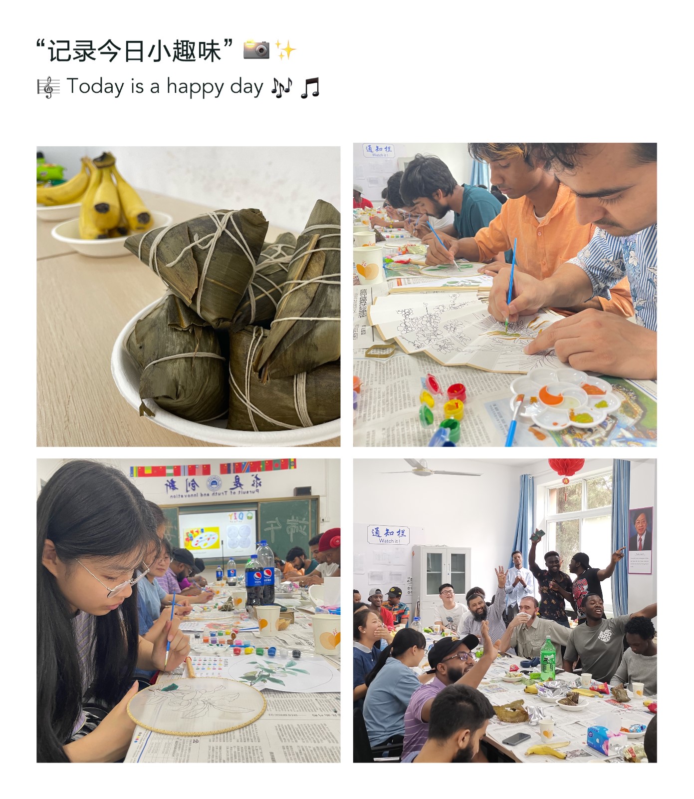 本次活动分为节日初探、品尝棕香、知识竞赛和团扇趣玩四个部分。节日初探不仅加强了师生们对端午历史的了解和文化认同,也为知识竞赛做好了铺垫。八宝馅和红枣馅粽香弥漫在整个教室,留香于唇齿之间,营造了浓浓节日氛围。将本次活动推至高潮的是知识竞赛,师生们积极参与,纷纷举手抢答,活动现场一片火热。令学生最新奇的环节是团扇DIY,团扇是汉朝时期的传统手工艺品,象征着团聚、幸福和好运。师生们极具耐心,认真地在团扇上一笔一画地勾勒着,好似在中国传统文化历史长河中徜徉,很多学生表示“这是我第一次尝试画团扇,我很喜欢”。最后,活动在师生的欢笑声中圆满结束。