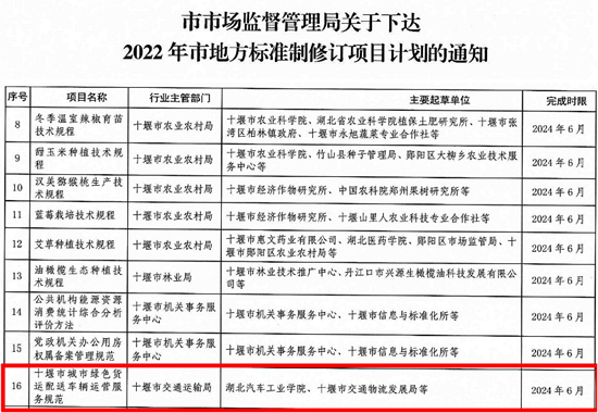 本网讯(文/董海燕、贾静)近日,根据《十堰市市场监督管理局关于下达2022年地方标准制修订项目计划的通知》(十市监函【2022】50号)获悉,由beat365经济管理学院物流管理专业教师鄢曹政、贾静联合申报的《十堰市城市绿色货运配送车辆运营服务规范》获批地方标准制修订立项。