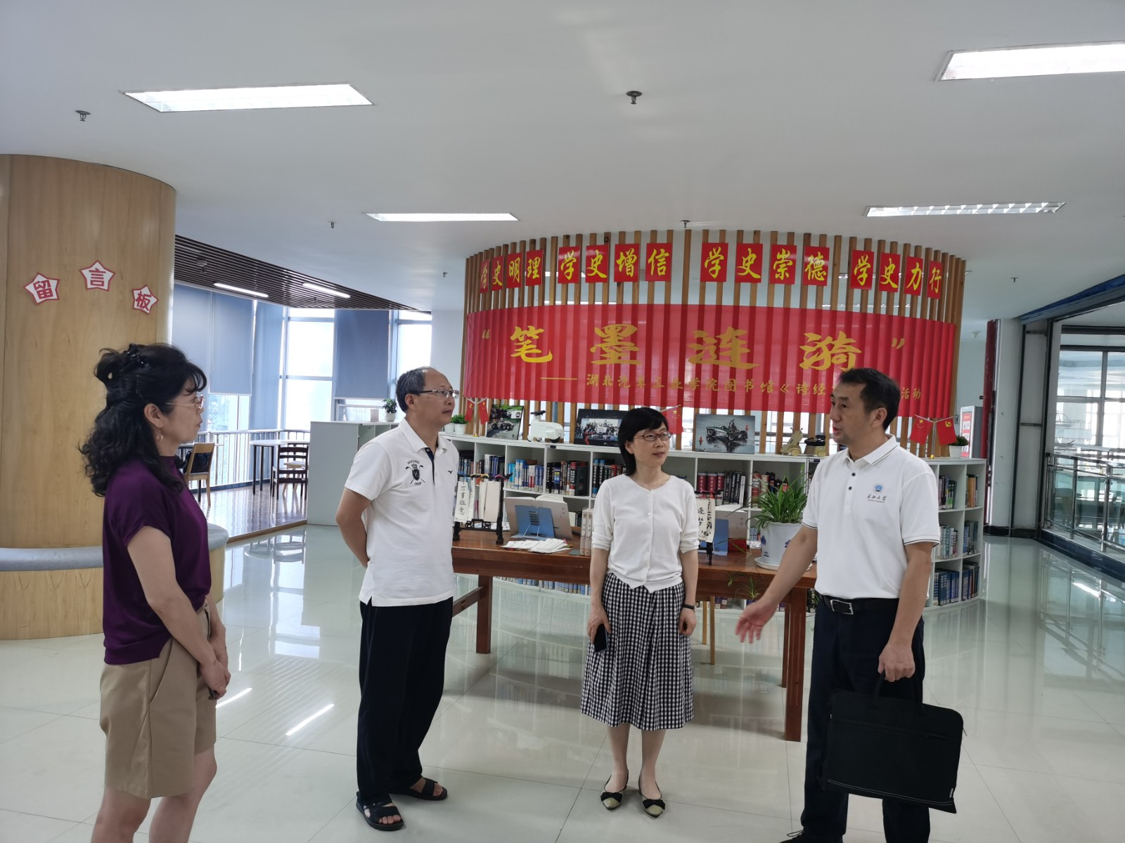 本网讯(文/图 翟永旭)6月27日下午,长江大学图书馆馆长王红松一行两人来beat365图书馆调研交流。图书馆馆长毕丽芳、书记马均秦和副馆长王念春陪同参观并参加座谈。