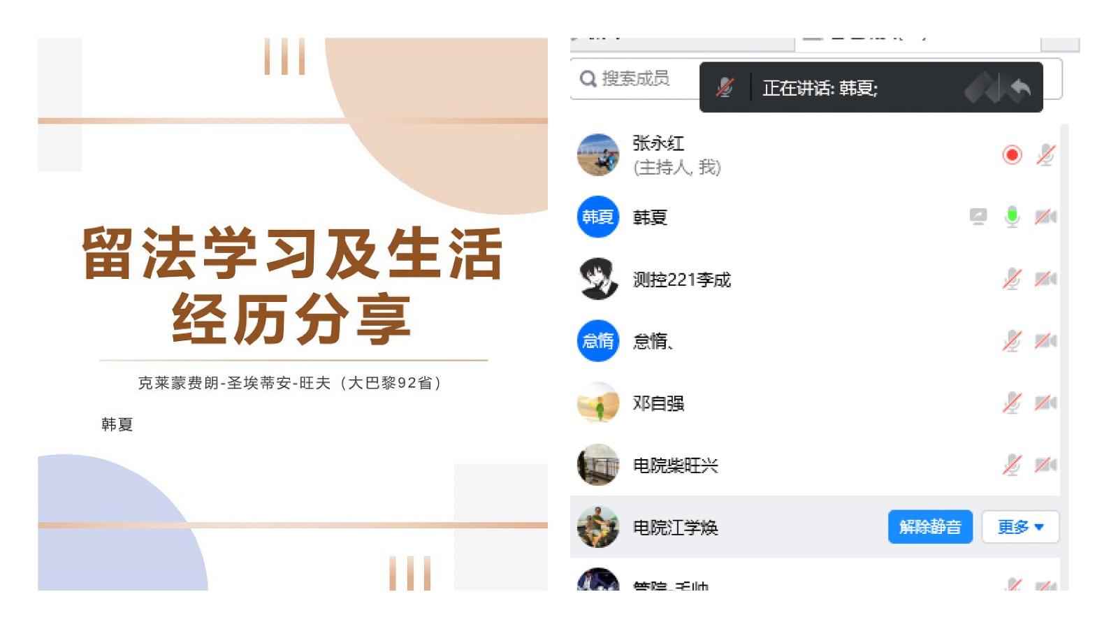 本网讯(文/赵雨晴)9月30日,国际处举办“迎校庆海外校友线上微沙龙”第二讲,邀请中法本硕连读项目2013届校友韩夏通过腾讯会议为在校生做留学经历分享。分享会由国际处赵雨晴主持,各二级学院有留学计划和对留学感兴趣的在校生以及老师以线上方式参加。