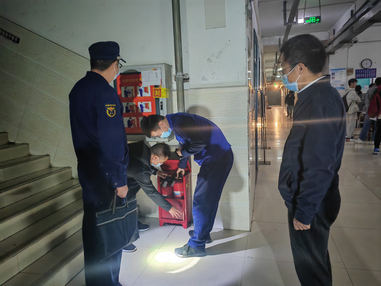 检查组一行重点检查了学校教学楼、宿舍楼的安全出口、消防安全疏散通道、消防应急照明、疏散指示标志、消防设施等,并走访学生宿舍,查看用电安全,了解学生消防知识掌握情况。