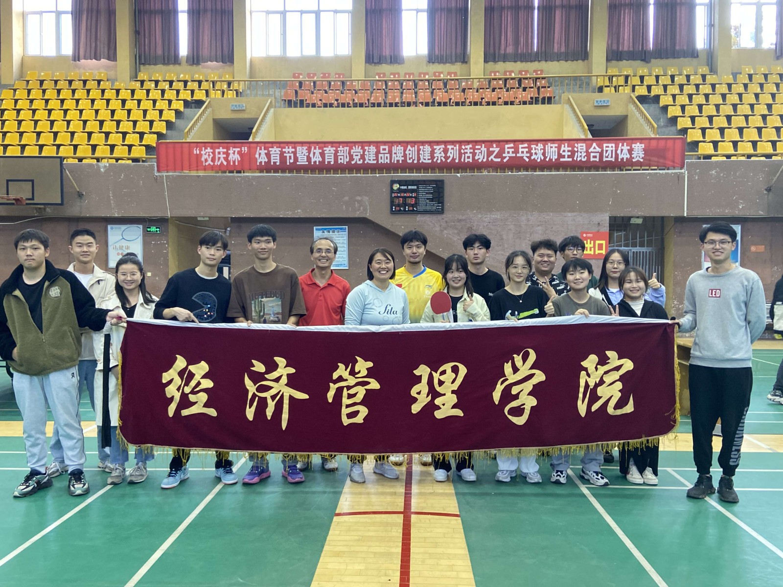 本网讯(文/陈楚楚)10月22日,“校庆杯”师生乒乓球混合团体赛在校体育馆火热开展,经济管理学院分党委副书记张晓玲带队,汪士为、蔡亮两名老师和7名学生代表学院参加比赛。