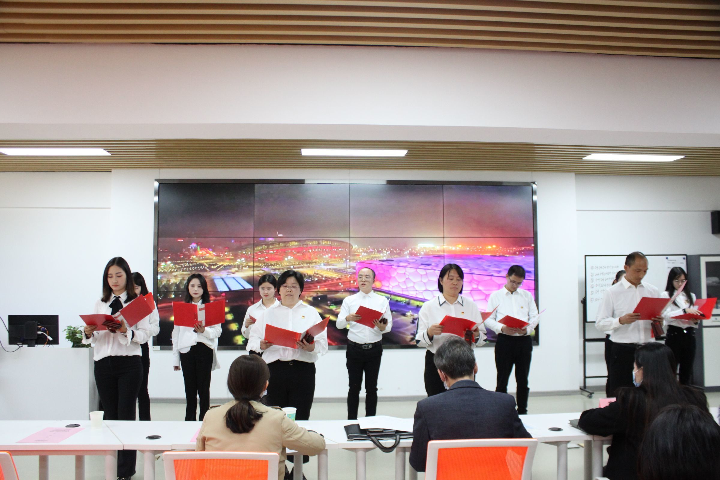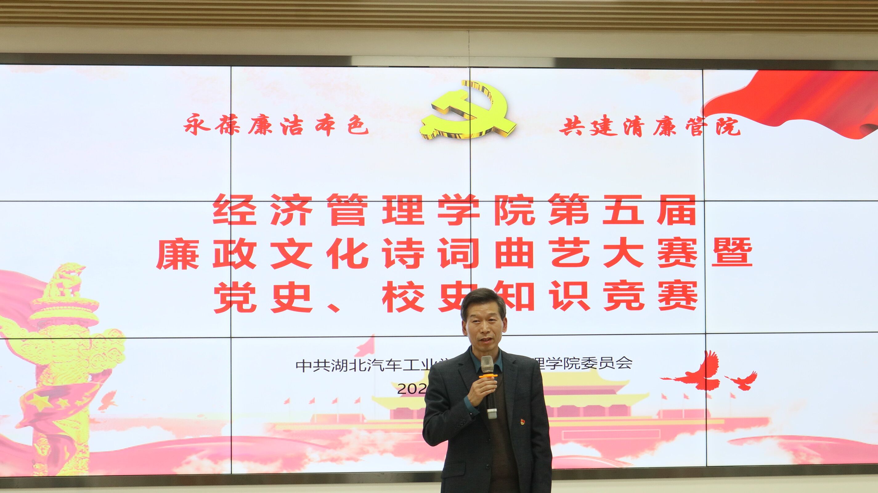 本网讯(文/郑媛元)10月31日下午,经济管理学院在第五教学楼四楼新商科智慧实验室举办了第五届廉政文化诗词曲艺大赛暨党史、校史知识竞赛。校纪委副书记兼综合室主任韩晓、工会常务副主席徐梅、团委文化艺术中心主任董煌煌担任评委。校党委常委、办公室主任、经济管理学院分党委书记王文山、经济管理学院领导班子成员、全体教职工、学生党员参加了此次活动。