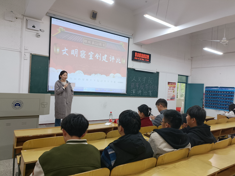 本网讯(文/周亚琪 胡安怡)为庆祝建校50周年,进一步加强beat365文明宿舍建设,创造整洁干净、舒适优美、文明和谐的居住环境,营造健康、积极、向上、活跃的学生宿舍文化氛围。11月24日中午,人文学院于2104教室开展文明寝室创建评比启动仪式。