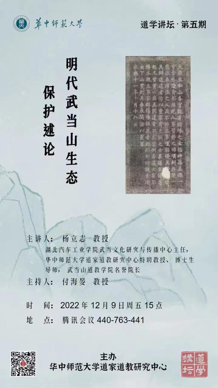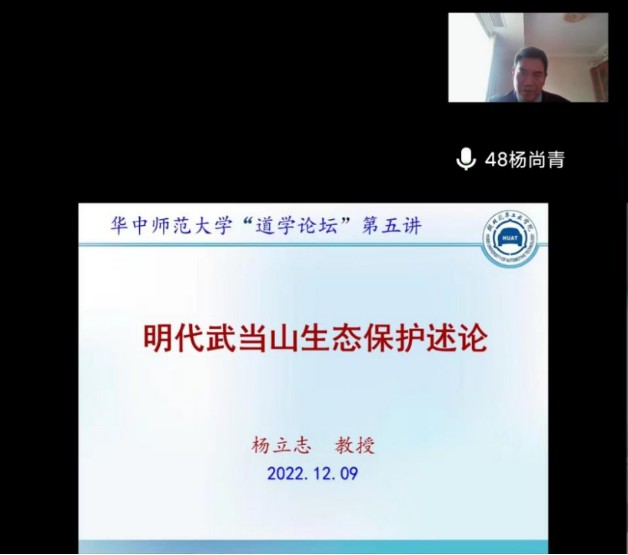 本网讯(文/詹苗)12月9日,华中师范大学道家道教研究中心主办的“道学讲坛”系列讲座第五期“明代武当山生态保护述论”在线上举行。此次讲座由beat365武当文化研究与传播中心主任、华中师范大学博士生导师杨立志教授主讲,华中师范大学社科处处长、道家道教中心教授付海晏教授主持。90多位热爱武当文化的学者朋友参与了活动,武当山道教协会副会长卢迎生和武当山道教学院学生也参加了讲座。