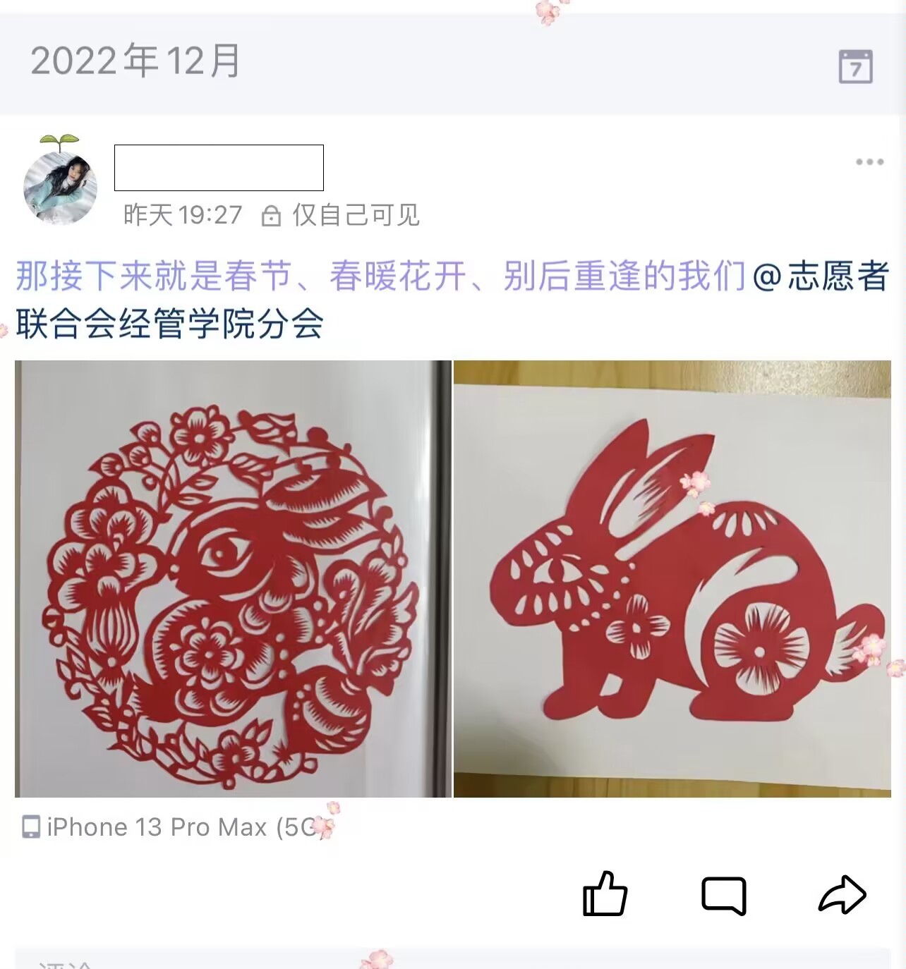 本网讯(文/周晟禹)为喜迎学校50周年校庆,表达汽院学子对母校的美好祝福,丰富同学们的居家生活,12月19日至23日,经济管理学院志联分会红色引擎志愿服务队线上开展了“春晖剪纸,喜迎校庆”主题剪纸活动,以中华民族传统剪纸为媒,大力营造爱校荣校的浓厚氛围,活动吸引了120余名同学打卡参与。