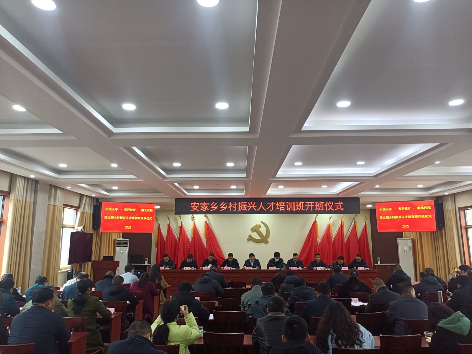 本网讯(文/吴迪)助力乡村振兴,做实助农帮扶。3月1日,中国人寿与省科技厅携手beat365在线唯一官网在郧西县安家乡开展第三期乡村振兴人才培训班。郧西县中国人寿挂职副县长袁圆、学校挂职副县长李建忠、省科技厅挂职副县长李刚、科技厅挂职干部江诗钢,继续教育学院党总支书记、院长张慧及安家乡党委政府主要负责人出席开班仪式,安家乡党委书记徐盛旺主持开班仪式,近百余名乡村振兴人才参加开班仪式。