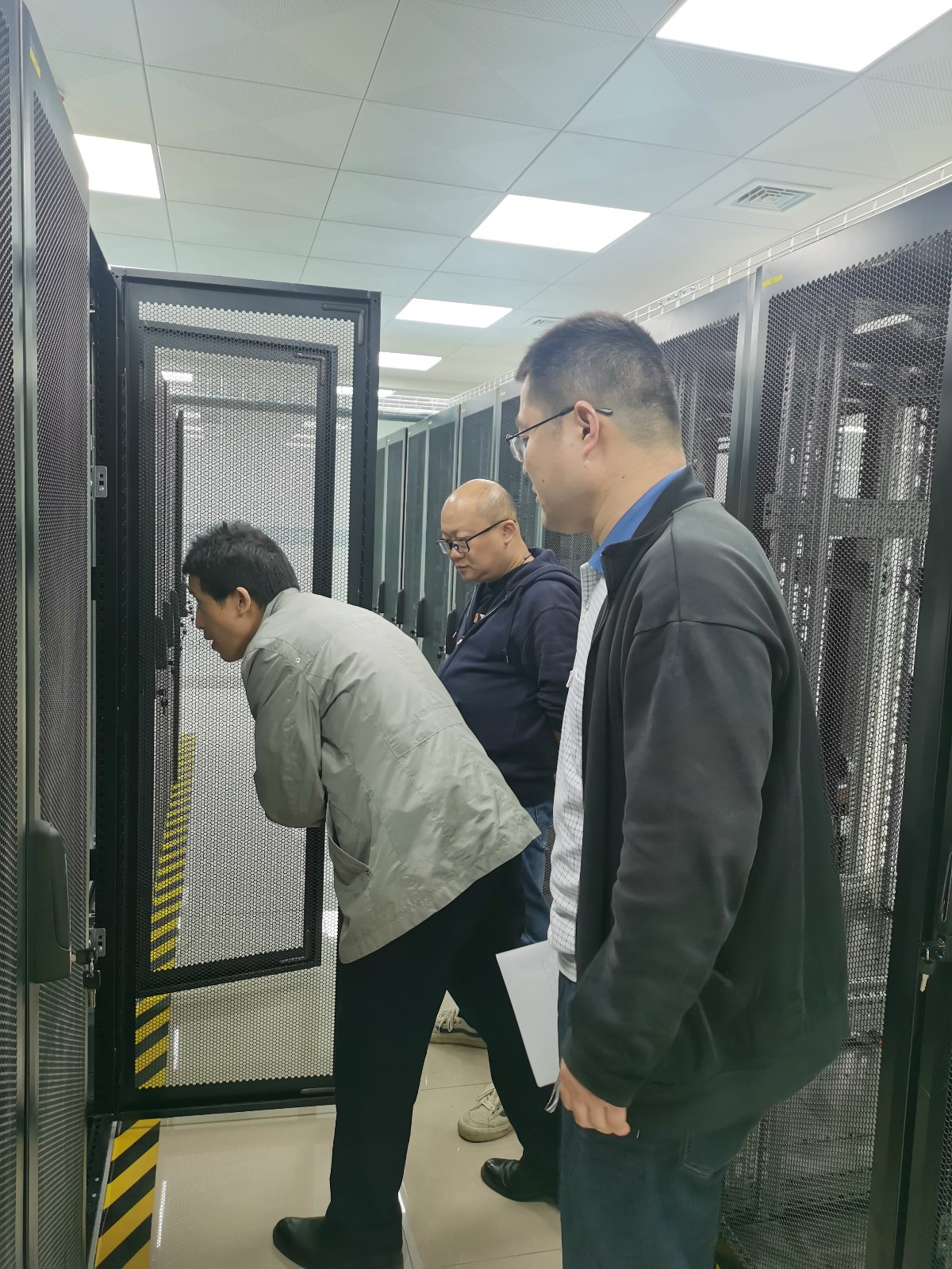 验收组专家首先听取了实施方对项目建设情况的介绍和讲解,审阅了相关验收材料,吴焰辉与信息技术中心就此次合作建设项目内容进行了深入的探讨交流,对项目实施现场进行了实地查看,在信息技术中心高性能计算中心机房对项目包含的服务器、存储等设备进行了逐一详细检查。