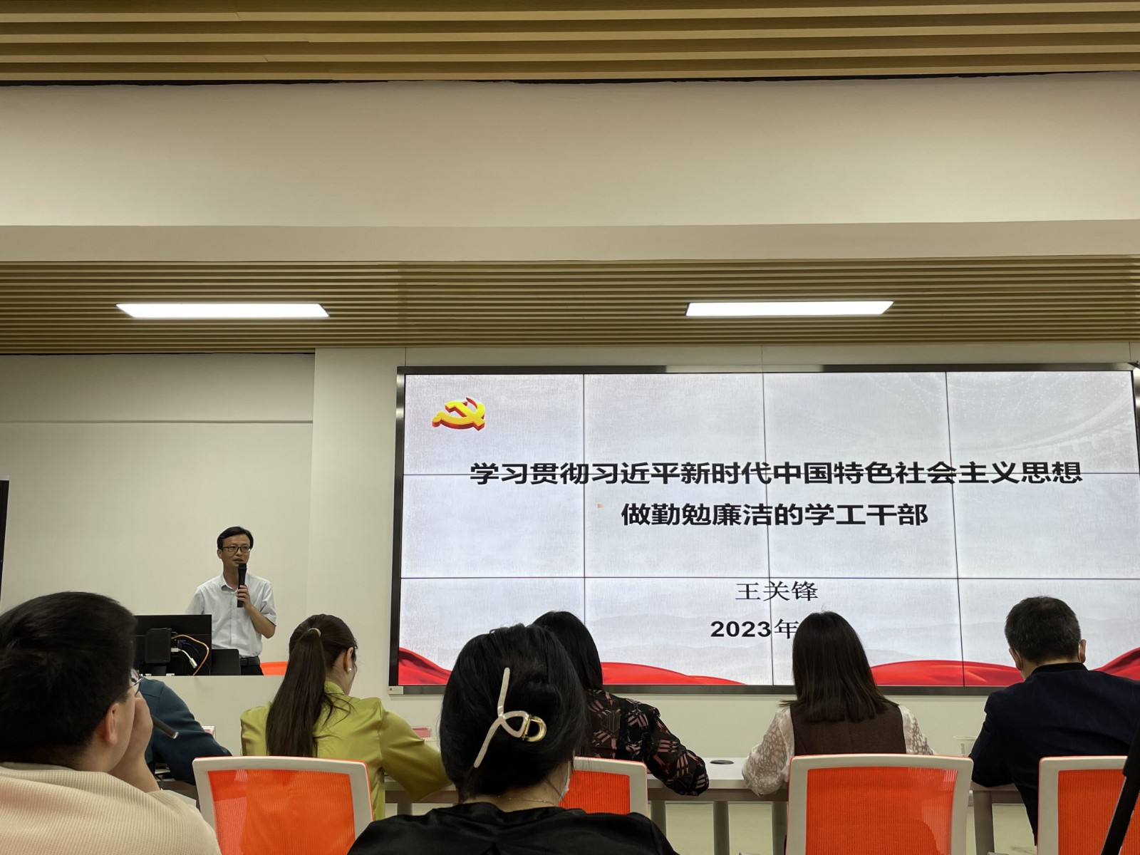 王关锋结合学工系统的特点和个人学习体会,以《学习贯彻习近平新时代中国特色社会主义思想做勤勉廉洁的学工干部》为主题,从主动协同、求真务实、敢于破冰试错、以严立威等四个方面为全体辅导员讲了一堂极具警示意义的廉政党课。他强调,学工队伍要统一思想,提高政治站位,认真学习学校相关文件,进一步增强做好学生工作的责任感和使命感,切实增强政治思想行动自觉。要树立底线思维,提高防范化解风险能力,做廉政勤政的学工人。