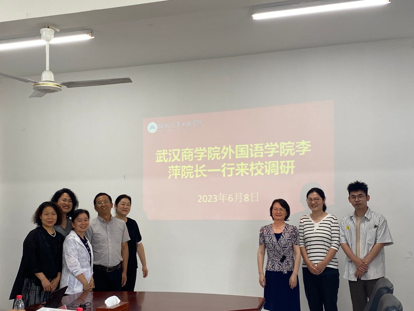 本网讯(文 王若男/图 王若男、段艳菊)6月8日上午,武汉商学院外国语学院院长李萍、日语系主任吴惠升、日语系教师蔡一升一行三人来beat365外国语学院开展专题工作调研。外国语学院副院长王辰晖、副院长翟全伟和专业负责人等7名教师在第三教学楼3503会议室与调研组进行了专题交流座谈。