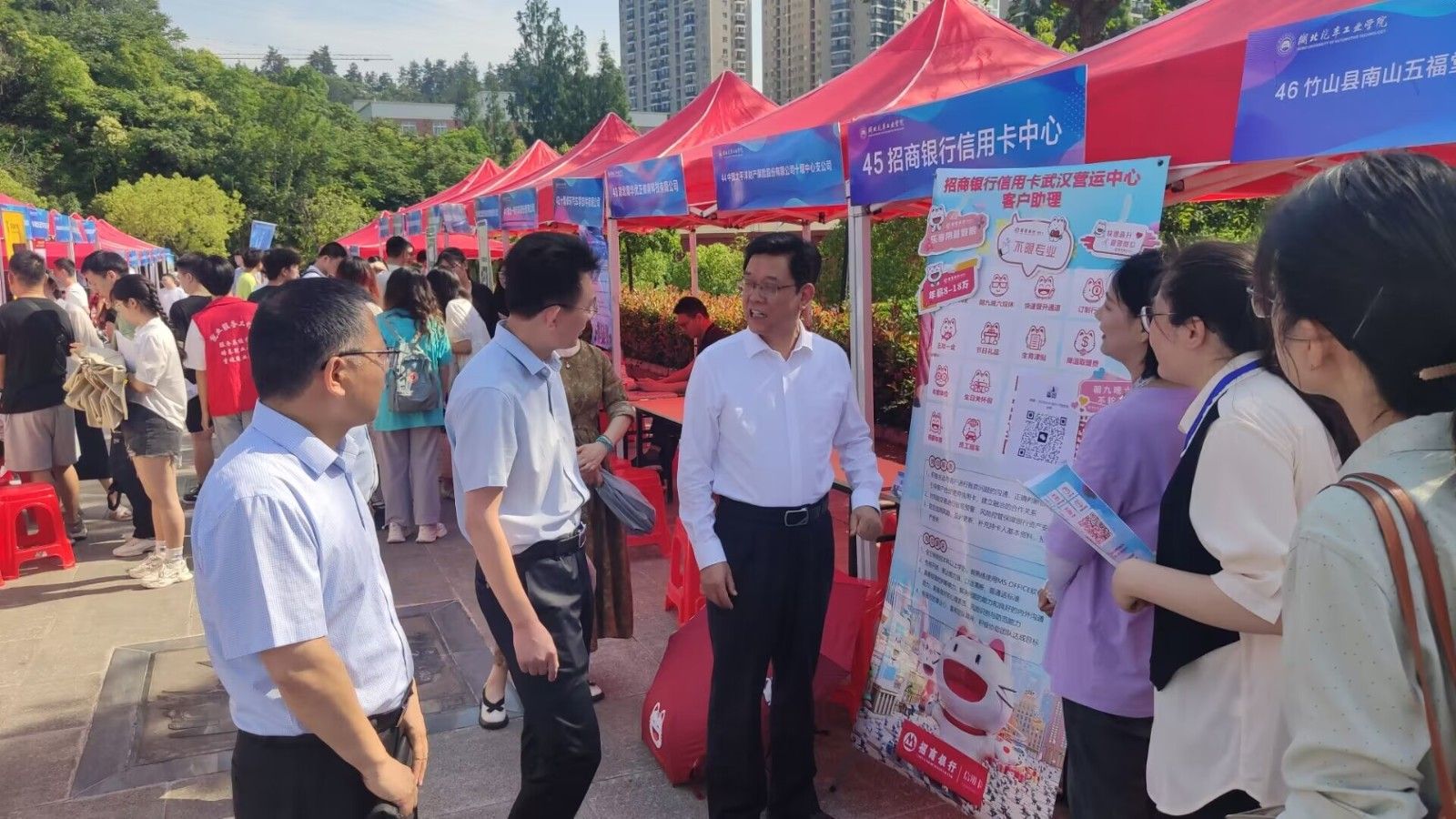 十堰市人大常委会副主任、党组成员卢熹昌一行莅临招聘会现场指导工作,现场调研了企业参会状况、招聘需求、招聘岗位及薪资待遇等情况。张湾区人社局有关负责同志,学校人事处处长李秀峰、招生与就业处副处长刘荣、继续教育学院副院长李秀刚,各二级学院副书记、就业辅导员参加活动。