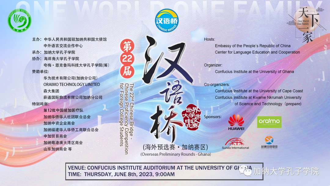 据悉,此次比赛由中国驻加纳大使馆、中外语言合作中心主办,第一次由加纳的三所大学---加纳大学UG、海岸角大学UCC、和恩克鲁玛科技大学KNUST孔子学院共同协办。比赛包括“天下一家”汉语主题演讲、中国文化才艺表演、中国文化知识问答三个环节。加纳三所大学孔子学院共12名选手进入决赛。