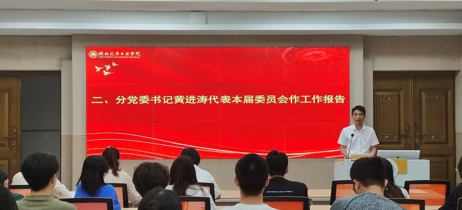 大会在雄壮的国歌声中拉开序幕。学院分党委书记黄进涛代表本届委员会作了工作报告,报告全面总结了本届委员会自成立后769天取得的成绩,以党建为引领,推动各项工作实现新突破,以发展为先导,教学科研成绩持续提升,以“三风”建设为抓手,学生工作取得实效;客观分析了存在的主要问题,明确提出了未来五年的主要目标和任务。