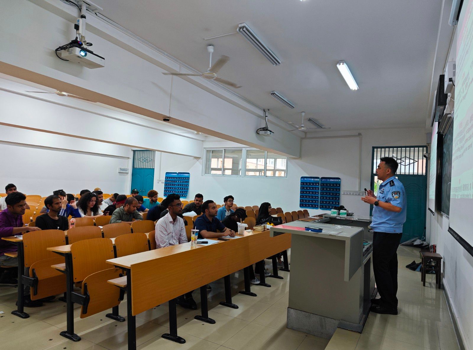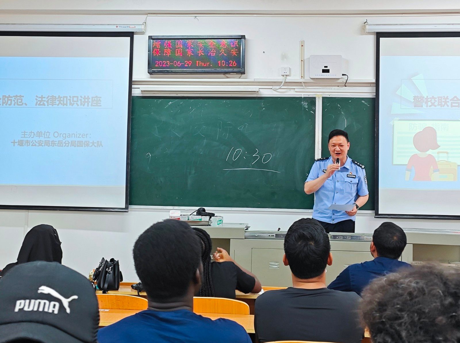 本网讯(文/图 张婷婷)6月29日上午,国际教育学院邀请十堰市公安局东岳分局出入境管理大队和国保大队警官一行入校开展警校联合安全、法律法规讲座及暑假安全班会。
