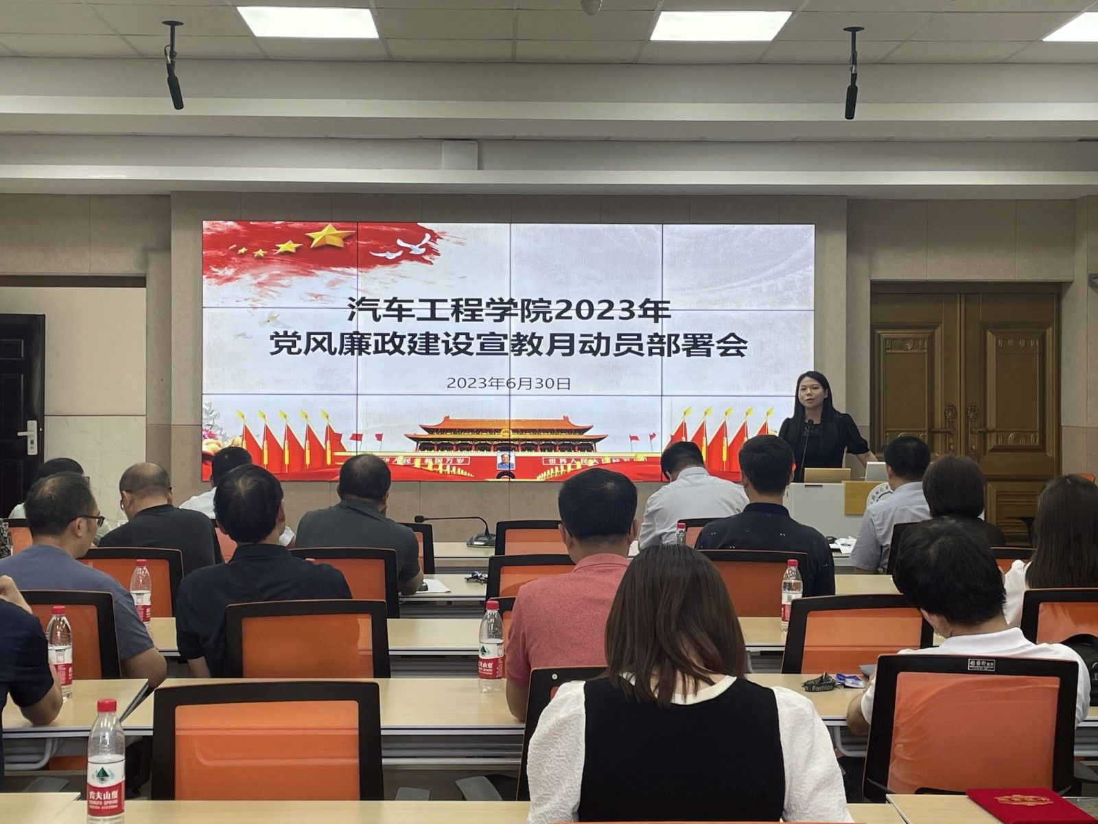 本网讯(文 胡霄寒、李旭/图 甘甜)为强化党风廉政教育,推进清廉学校建设,6月30日,汽车工程学院分党委在1305教室召开学院2023年党风廉政建设宣传教育月活动工作部署会,全体教职工参会。会议由分党委书记杨亚会主持。