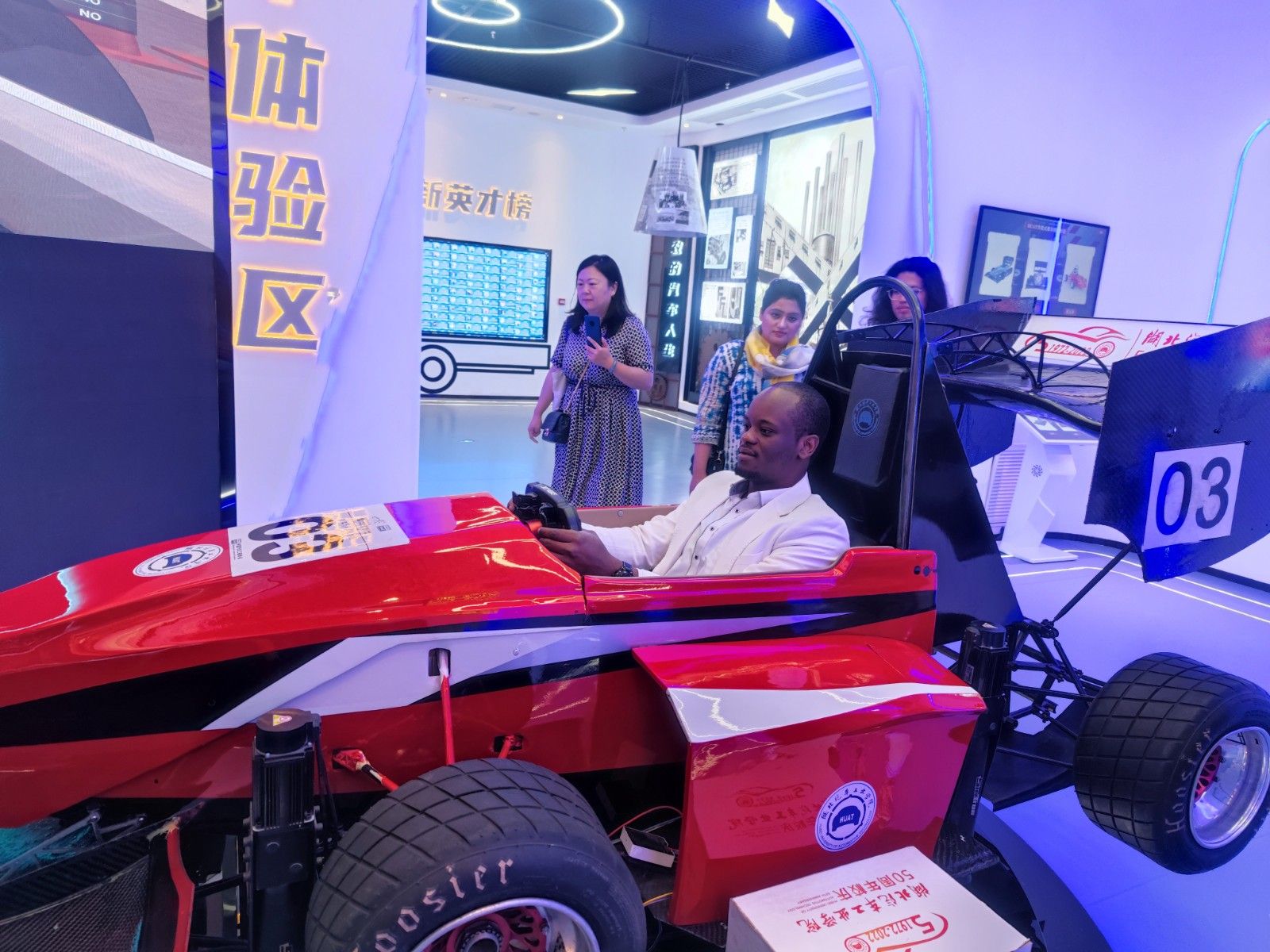 在方程式赛车和智能车体验课程中,外国留学生们走进车队工作室,通过与车队成员的深度交流,全面了解了车队的历史及获得的荣誉奖项,用镜头记录下了队员们的工作场景。在科创展示交流中心,他们领略赛车VR、AR、MR体验区、试驾虚拟F1赛车,切身体验速度与激情的驾驶乐趣,通过展望厅天幕屏构成的创想空间,沉浸式体验了新能源、智能网联、无人驾驶、飞行汽车的未来想象。