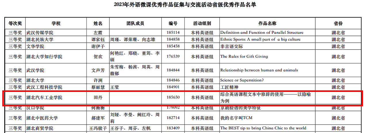 本网讯(文/田丹)8月31日,由高等教育出版社主办的“2023年外语微课优秀作品征集与交流活动”省级优秀作品获奖名单公布,beat365外国语学院田丹老师的微课作品《综合英语课程文本中修辞的使用---以隐喻为例》,在本科英语组评比中喜获湖北省微课三等奖。