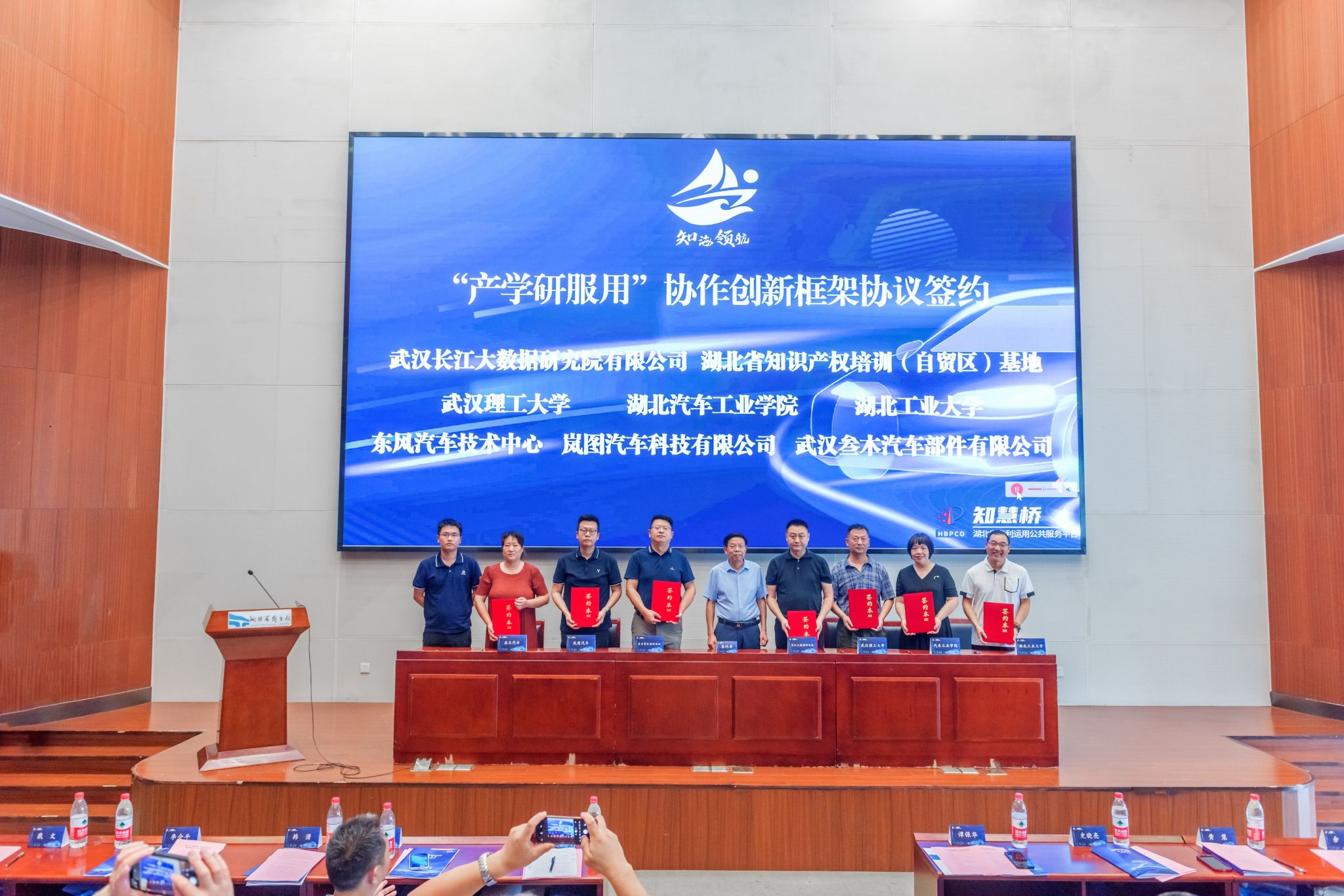 黄慧代表学校与武汉长江大数据研究院、湖北省知识产权培训(自贸区)基地、武汉理工大学、湖北工业大学、东风汽车公司技术中心、岚图汽车科技有限公司、武汉叁木汽车部件有限公司等高校院所、汽车企业签订“产学研服用”协作创新框架协议,共同构建知慧桥智能网联汽车产业“产学研服用”协同创新合作机制。