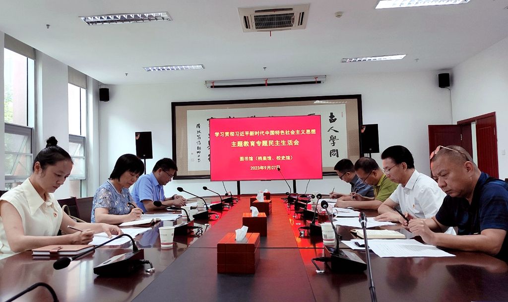 本网讯(文/图 王红)9月7日上午,图书馆(档案馆、校史馆)党支部在图书馆一楼会议室召开学习贯彻习近平新时代中国特色社会主义思想主题教育专题民主生活会。学校第五督导组组长张红霞到会指导,图书馆(档案馆、校史馆)全体班子成员参加会议。会议由党支部书记陈战锋主持。