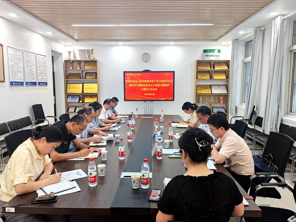 本网讯(文/张朋刚)9月7日晚,数理与光电工程学院分党委在第一教学楼1126会议室召开领导班子学习贯彻习近平新时代中国特色社会主义思想主题教育专题民主生活会,学校第八督导组组长王镇到会指导。数理与光电工程学院领导班子成员参加会议,会议由分党委书记张默主持。
