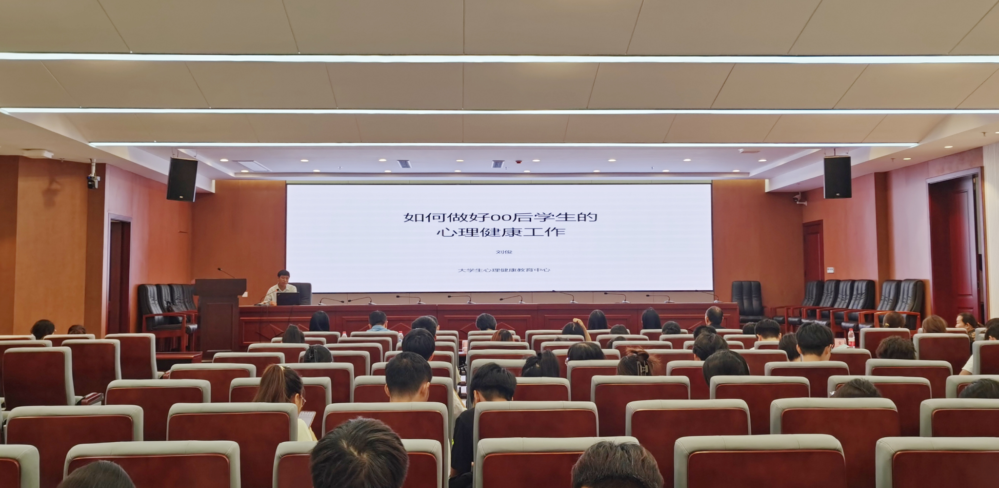 学工部心理健康教育中心刘俊从00后学生心理特征为切入向大家介绍了当前心理健康教育工作的形势,并分享了心理健康教育的工作技巧及学生心理危机预警途径,他提出大学阶段是个体心理发展的关键时期,请大家对新生心理健康予以高度重视,对新生群体适应大学生活给予关怀和帮助。