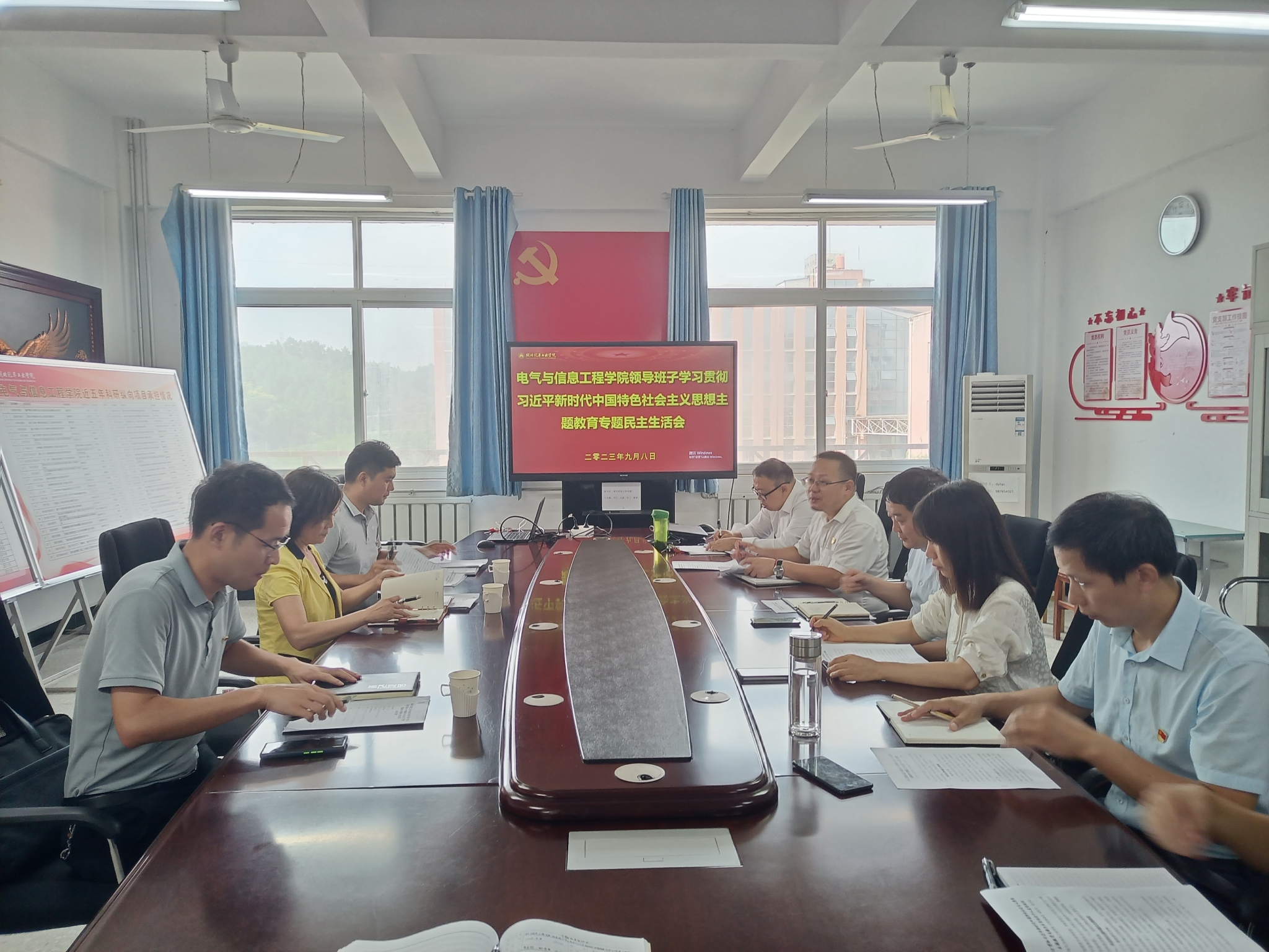 本网讯(文/曾又)9月8日下午,电气与信息工程学院分党委在S6521召开领导班子学习贯彻习近平新时代中国特色社会主义思想主题教育专题民主生活会,学校第四督导组组长林雪荣带队到会指导。电气与信息工程学院领导班子全体参加会议,会议由分党委书记周鹏主持。