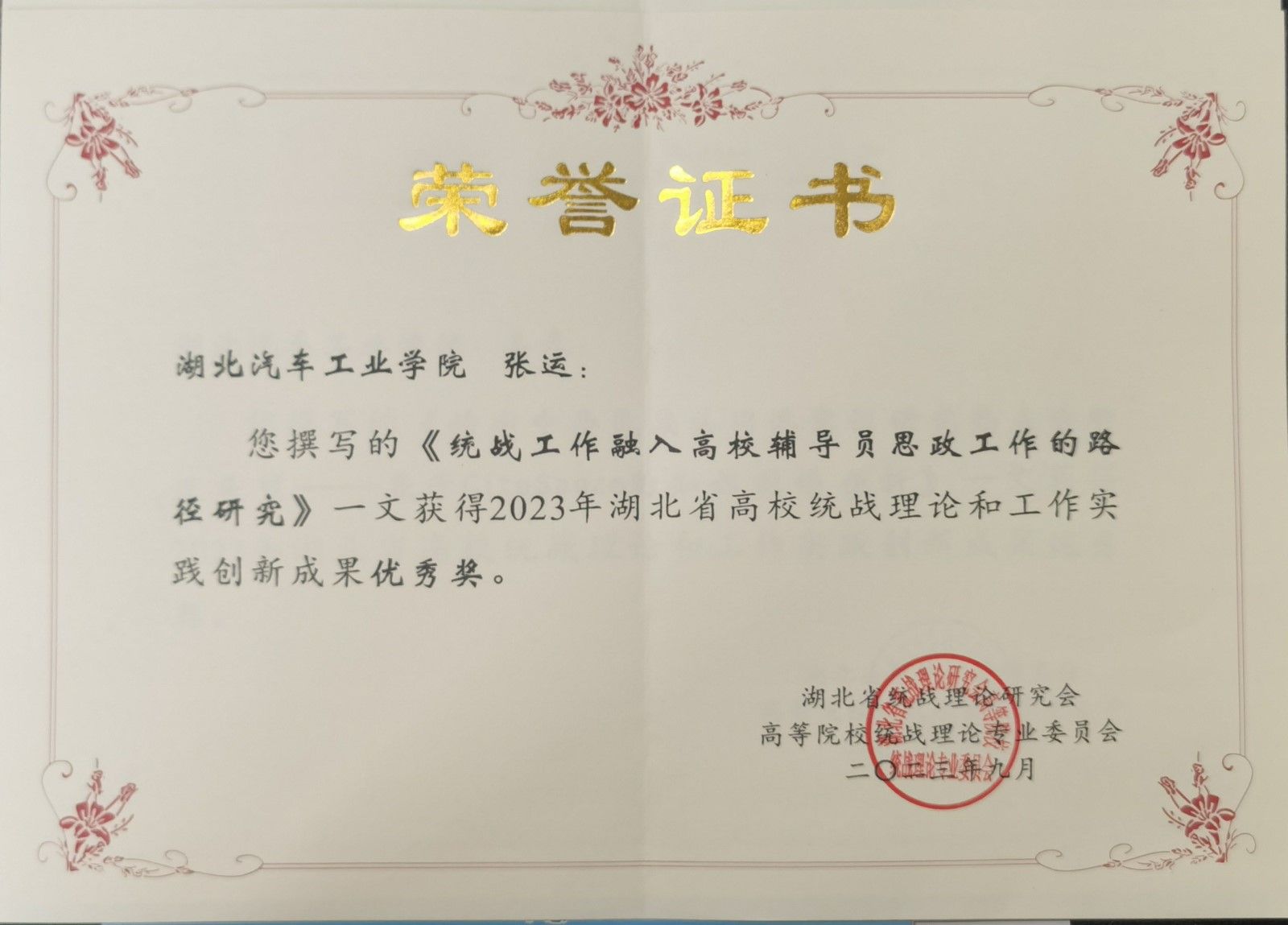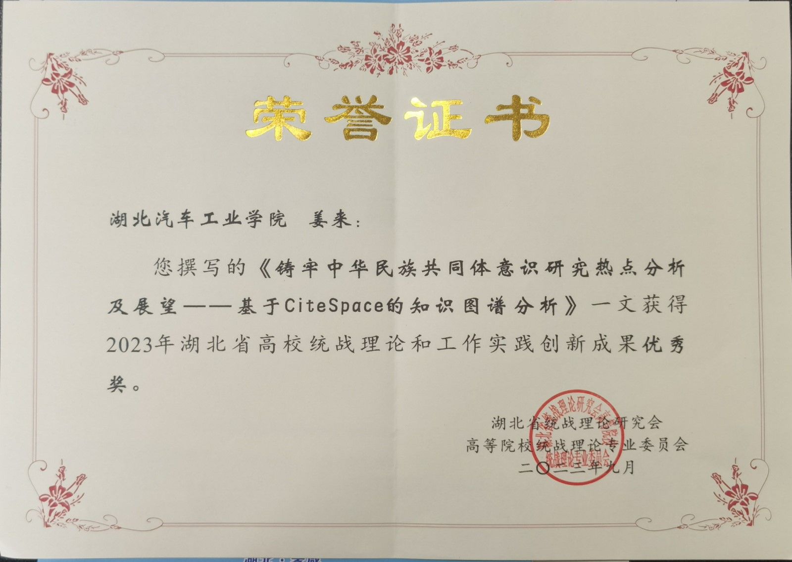 本网讯(文/肖越)9月19-21日,湖北省高校统战理论研究会第38次学术年会于在湖北孝感召开,会上对2023年湖北省高校统战理论研究会统战理论和工作实践创新成果进行了通报。beat365研究生院姜来老师的论文《铸牢中华民族共同体意识研究热点分析及展望——基于CiteSpace的知识图谱分析》和武汉产学研基地张运老师的论文《统战工作融入高校辅导员思政工作的路径研究》获评优秀奖。