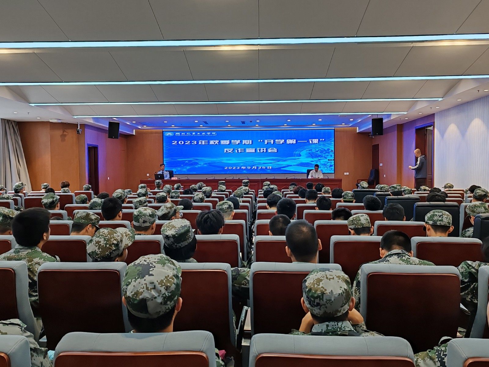 本网讯(文 官杰/图 李海庆)为全方位提升师生防范电信网络诈骗能力,增强安全防范意识,筑牢反诈防骗心堤,9月25日下午,学校举办2023年秋季学期“开学第一课”反诈宣讲会,200余名新生代表参加。宣讲会特邀请了十堰市公安局反诈中心负责人毛群主讲。会议由保卫处处长杨长春主持。