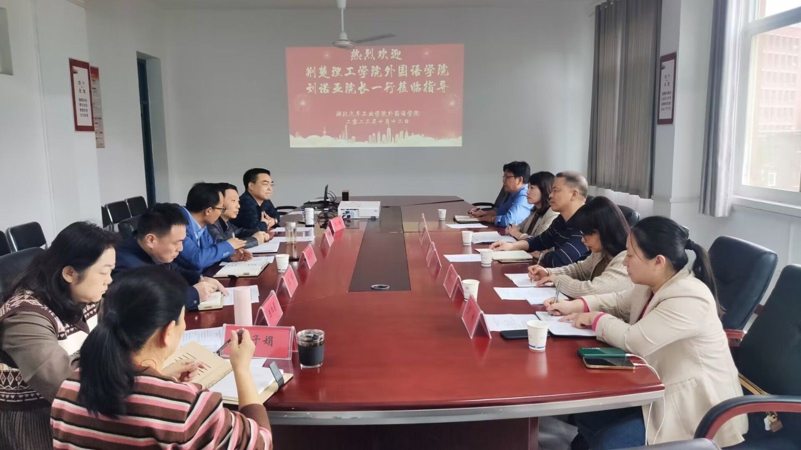本网讯(文/图 任俊超)10月12日下午,荆楚理工学院外国语学院院长刘诺亚、副院长吴晓凤一行来校调研交流,外国语学院院长杨荣广、副院长王辰晖、分党委副书记魏伟热情接待,并在学院会议室举行座谈交流。