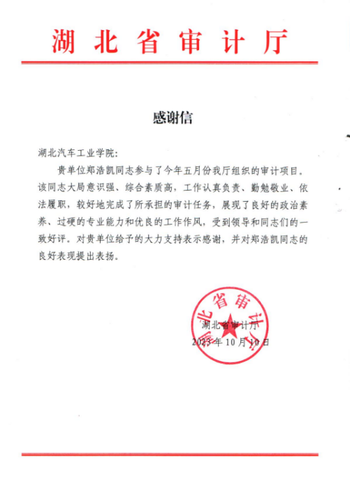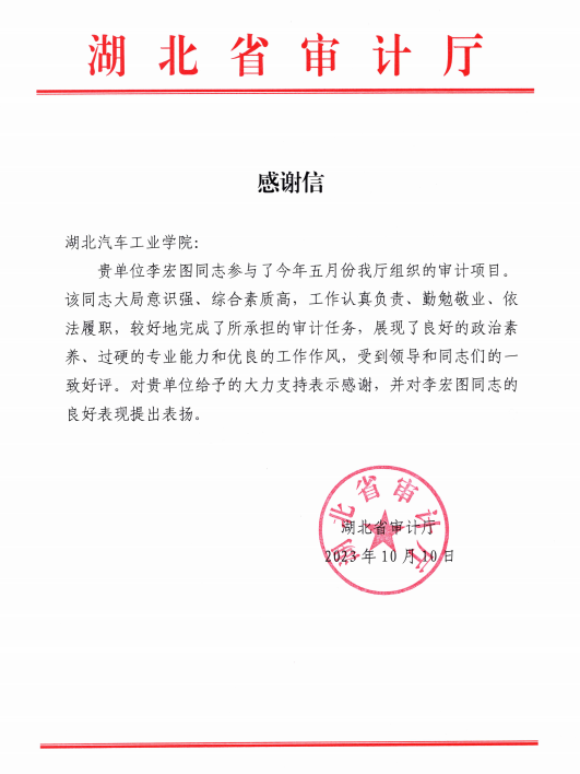 本网讯(文/李宏图)近日,学校收到来自湖北省审计厅的感谢信,对学校选派李宏图、郑浩凯两名同志参与今年5月份审计厅组织的审计项目支持表达感谢,并对上述两名同志的良好表现提出表扬,这是继今年学校获“全省内部审计高质量建设试点单位”授牌后,再一次获得省审计厅的对beat365审计工作的肯定。